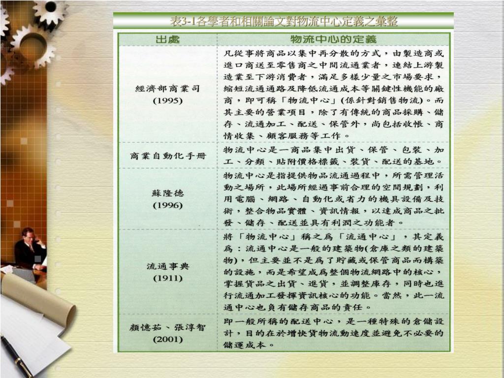 第三章. 物流中心作業流程及其規劃介紹 李宗儒 著. 學習目標. 瞭解物流中心定義 瞭解物流中心的種類 瞭解物流中心的作業流程 瞭解物流中心的規劃及營運的關鍵成功因素. 3-1物流中心的基本介紹. 3-1-1物流中心的定義. 表 3-1 各學者和相關論文對物流中心定義之彙整. 3-1-2物流中心的種類. 專業物流中心(開放型物流中心) 封閉型物流中心 混合型物流中心 批發型物流中心. 表 3-2 物流中心種類的整理. 資料來源:本研究整理. 3-2物流中心的作業流程. 進貨 搬運 儲存 盤點 訂單. 揀貨 補貨 出貨 配送.