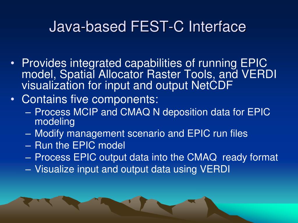 Java-based FEST-C Interface • Provides integrated capabilities of running EPIC model, Spatial Allocator Raster Tools, and VERDI visualization for input and output NetCDF • Contains five components: • Process MCIP and CMAQ N deposition data for EPIC modeling • Modify management scenario and EPIC run files • Run the EPIC model • Process EPIC output data into the CMAQ ready format • Visualize input and output data using VERDI