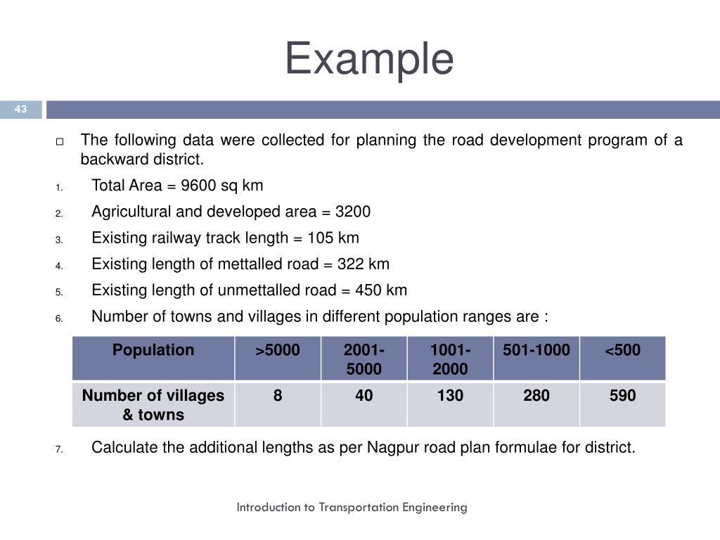 Example • The following data were collected for planning the road development program of a backward district. • Total Area = 9600 sq km • Agricultural and developed area = 3200 • Existing railway track length = 105 km • Existing length of mettalled road = 322 km • Existing length of unmettalled road = 450 km • Number of towns and villages in different population ranges are : • Calculate the additional lengths as per Nagpur road plan formulae for district. Introduction to Transportation Engineering