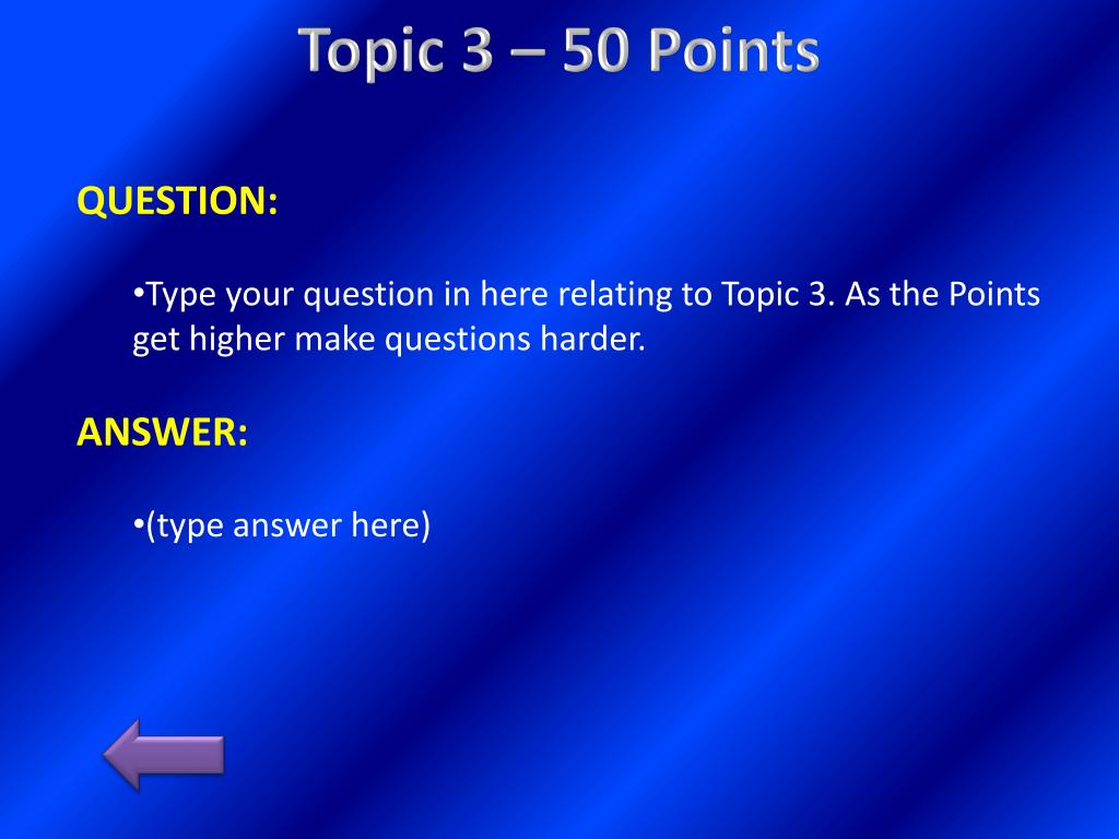 Topic 2 – 50 Points • QUESTION: • Type your question in here relating to Topic 2. As the Points get higher make questions harder. • ANSWER: • (type answer here)