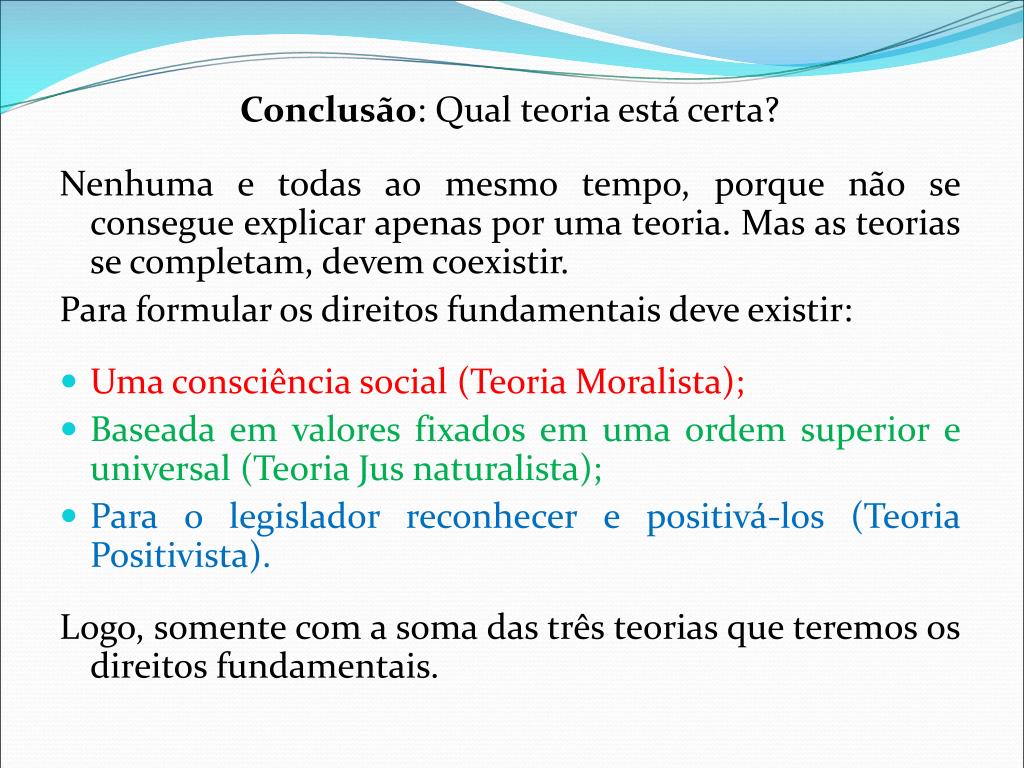 Conclusão: Qual teoria está certa? Nenhuma e todas ao mesmo tempo, porque não se consegue explicar apenas por uma teoria. Mas as teorias se completam, devem coexistir. Para formular os direitos fundamentais deve existir: • Uma consciência social (Teoria Moralista); • Baseada em valores fixados em uma ordem superior e universal (Teoria Jus naturalista); • Para o legislador reconhecer e positivá-los (Teoria Positivista). Logo, somente com a soma das três teorias que teremos os direitos fundamentais.
