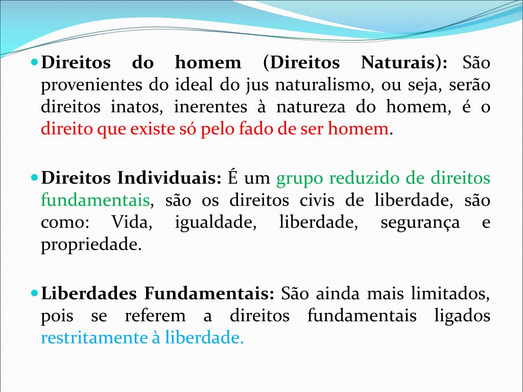 Direitos do homem (Direitos Naturais):São provenientes do ideal do jus naturalismo, ou seja, serão direitos inatos, inerentes à natureza do homem, é o direito que existe só pelo fado de ser homem. • Direitos Individuais: É um grupo reduzido de direitos fundamentais, são os direitos civis de liberdade, são como: Vida, igualdade, liberdade, segurança e propriedade. • Liberdades Fundamentais: São ainda mais limitados, pois se referem a direitos fundamentais ligados restritamente à liberdade.
