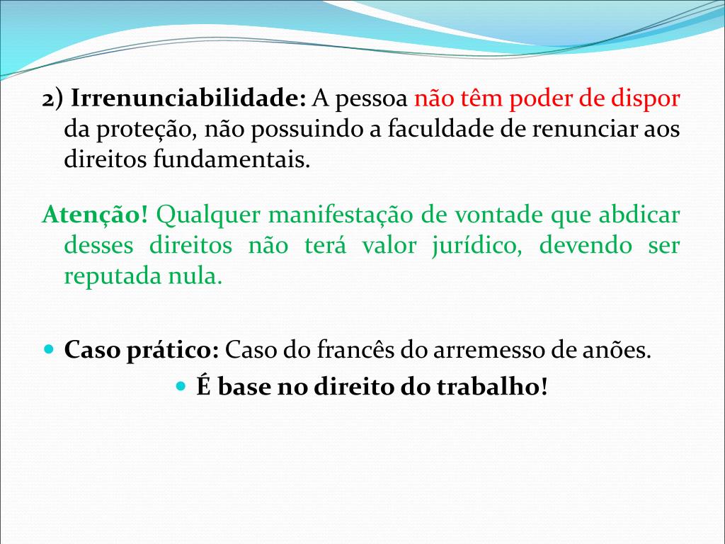 2) Irrenunciabilidade: A pessoa não têm poder de dispor da proteção, não possuindo a faculdade de renunciar aos direitos fundamentais. Atenção! Qualquer manifestação de vontade que abdicar desses direitos não terá valor jurídico, devendo ser reputada nula. • Caso prático: Caso do francês do arremesso de anões. • É base no direito do trabalho!