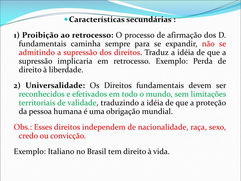 Características secundárias : 1) Proibição ao retrocesso: O processo de afirmação dos D. fundamentais caminha sempre para se expandir, não se admitindo a supressão dos direitos. Traduz a idéia de que a supressão implicaria em retrocesso. Exemplo: Perda de direito à liberdade. 2) Universalidade: Os Direitos fundamentais devem ser reconhecidos e efetivados em todo o mundo, sem limitações territoriais de validade, traduzindo a idéia de que a proteção da pessoa humana é uma obrigação mundial. Obs.: Esses direitos independem de nacionalidade, raça, sexo, credo ou convicção. Exemplo: Italiano no Brasil tem direito à vida.
