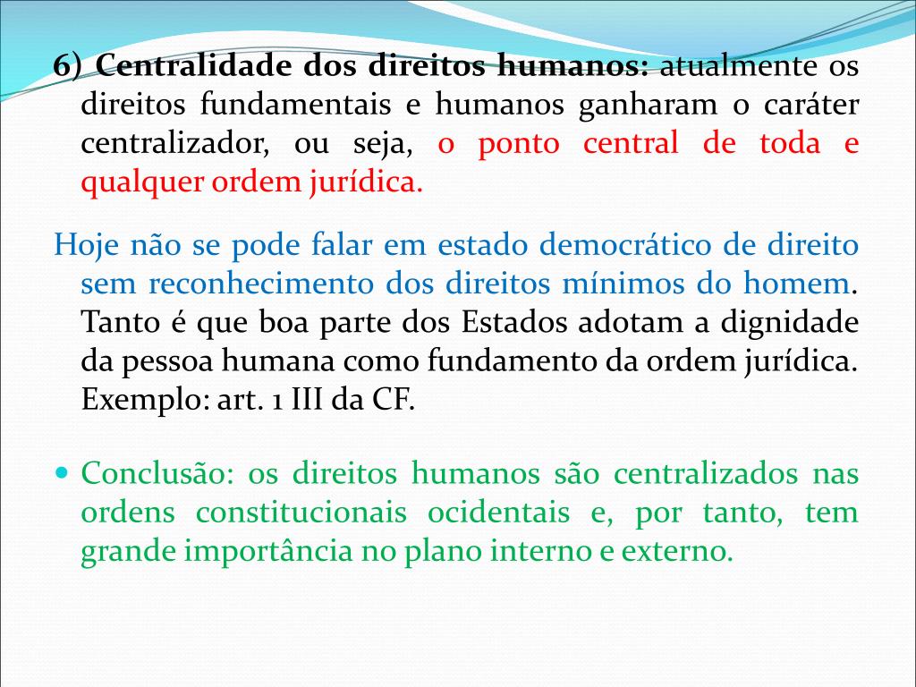 6) Centralidade dos direitos humanos: atualmente os direitos fundamentais e humanos ganharam o caráter centralizador, ou seja, o ponto central de toda e qualquer ordem jurídica. Hoje não se pode falar em estado democrático de direito sem reconhecimento dos direitos mínimos do homem. Tanto é que boa parte dos Estados adotam a dignidade da pessoa humana como fundamento da ordem jurídica. Exemplo: art. 1 III da CF. • Conclusão: os direitos humanos são centralizados nas ordens constitucionais ocidentais e, por tanto, tem grande importância no plano interno e externo.