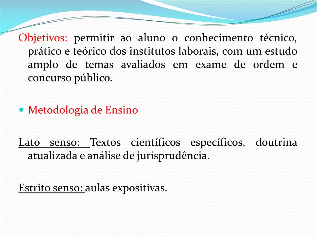 Objetivos: permitir ao aluno o conhecimento técnico, prático e teórico dos institutos laborais, com um estudo amplo de temas avaliados em exame de ordem e concurso público. • Metodologia de Ensino Lato senso: Textos científicos específicos, doutrina atualizada e análise de jurisprudência. Estrito senso: aulas expositivas.