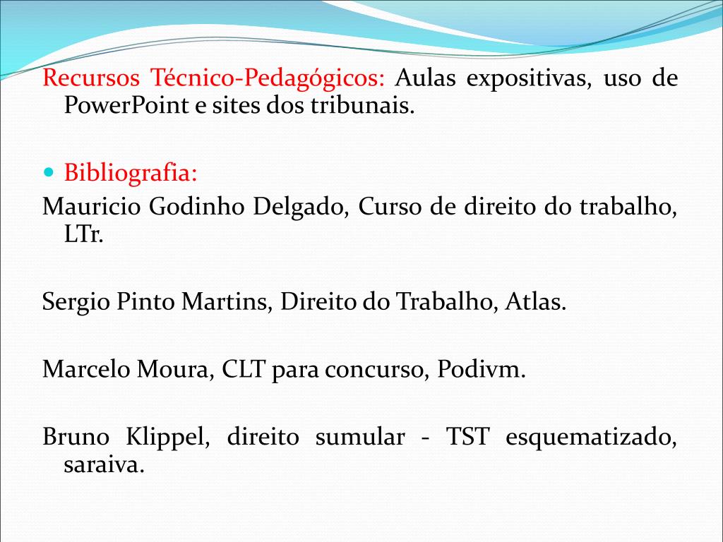 Recursos Técnico-Pedagógicos: Aulas expositivas, uso de PowerPoint e sites dos tribunais. • Bibliografia: Mauricio Godinho Delgado, Curso de direito do trabalho, LTr. Sergio Pinto Martins, Direito do Trabalho, Atlas. Marcelo Moura, CLT para concurso, Podivm. Bruno Klippel, direito sumular - TST esquematizado, saraiva.