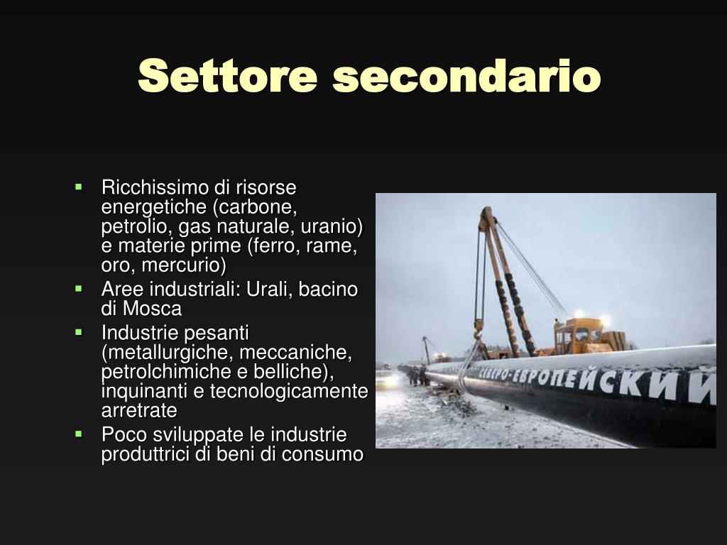 Settore secondario • Ricchissimo di risorse energetiche (carbone, petrolio, gas naturale, uranio) e materie prime (ferro, rame, oro, mercurio) • Aree industriali: Urali, bacino di Mosca • Industrie pesanti (metallurgiche, meccaniche, petrolchimiche e belliche), inquinanti e tecnologicamente arretrate • Poco sviluppate le industrie produttrici di beni di consumo