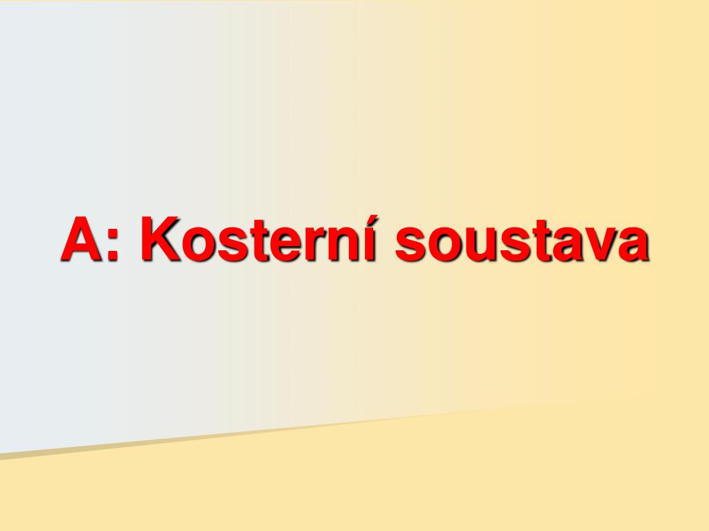 A: Kosterní soustava. Kostra (= skelet) se dá rozdělit na několik částí: 1) Osový skelet 2) Lebka 3) Kostra končetin. 1) Osový skelet tvoří základ kostry (napojuje se lebka a kostra končetin) páteř, žebra a hrudní kost. Vývoj osového skeletu.