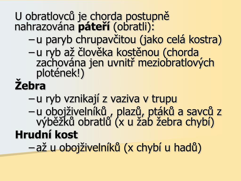 U obratlovců je chorda postupně nahrazována páteří (obratli): u paryb chrupavčitou (jako celá kostra) u ryb až člověka kostěnou (chorda zachována jen uvnitř meziobratlových plotének!) Žebra u ryb vznikají z vaziva v trupu u obojživelníků , plazů, ptáků a savců z výběžků obratlů (x u žab žebra chybí) Hrudní kost až u obojživelníků (x chybí u hadů)