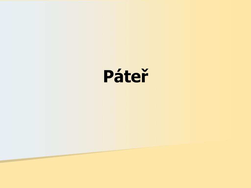 Páteř (columna vertebralis) z 33 – 34 obratlů, uvnitř páteřní kanál kvůli vzpřímenému držení těla 2x esovitě prohnutá pérování při chůzi zakřivení se vyvíjí do 5 – 6 let prohnutí dozadu = kyfóza (hrudní, křížová) ř. kyfos = křivý prohnutí dopředu = lordóza (krční, bederní) ř. lordos = prohnutí vpřed