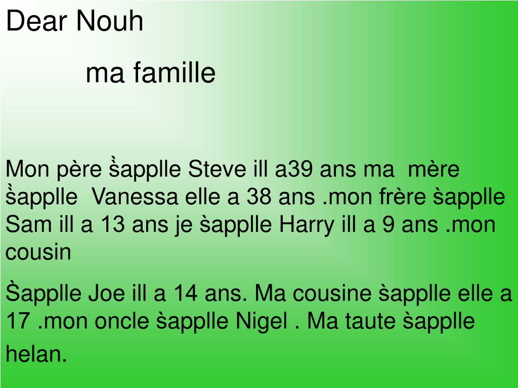 Dear Nouh ma famille Mon père s̀̀applle Steve ill a39 ans ma mère s̀̀applle Vanessa elle a 38 ans .mon frère s̀applle Sam ill a 13 ans je s̀applle Harry ill a 9 ans .mon cousin S̀applle Joe ill a 14 ans. Ma cousine s̀applle elle a 17 .mon oncle s̀applle Nigel . Ma taute s̀applle helan.