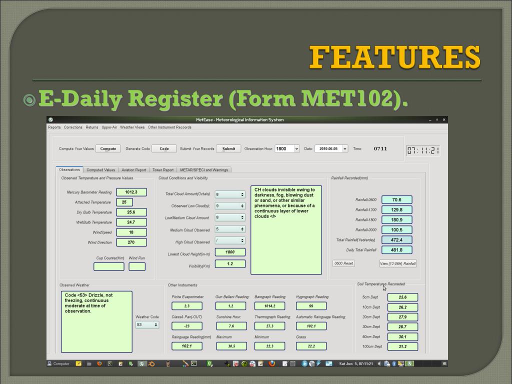 User friendly & Interactive. • Accurate Auto Computation of derived weather elements. • Auto coding of synoptic messages and transmission. • Save message preparation Time and deliver SYNOPTIC MESSAGES promptly .