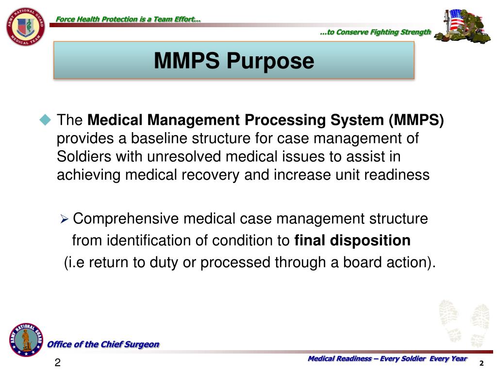 MMPS Purpose • The Medical Management Processing System (MMPS) provides a baseline structure for case management of Soldiers with unresolved medical issues to assist in achieving medical recovery and increase unit readiness • Comprehensive medical case management structure • from identification of condition to finaldisposition • (i.e return to duty or processed through a board action). 2