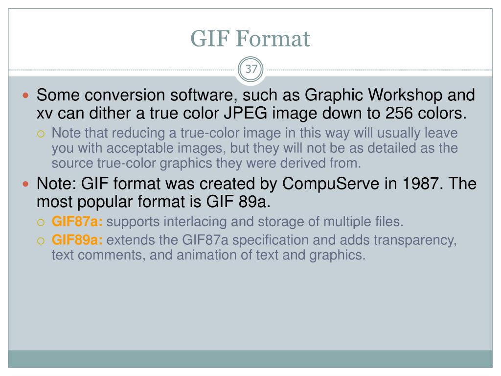 GIF Format • Some conversion software, such as Graphic Workshop and xv can dither a true color JPEG image down to 256 colors. • Note that reducing a true-color image in this way will usually leave you with acceptable images, but they will not be as detailed as the source true-color graphics they were derived from. • Note: GIF format was created by CompuServe in 1987. The most popular format is GIF 89a. • GIF87a: supports interlacing and storage of multiple files. • GIF89a: extends the GIF87a specification and adds transparency, text comments, and animation of text and graphics.