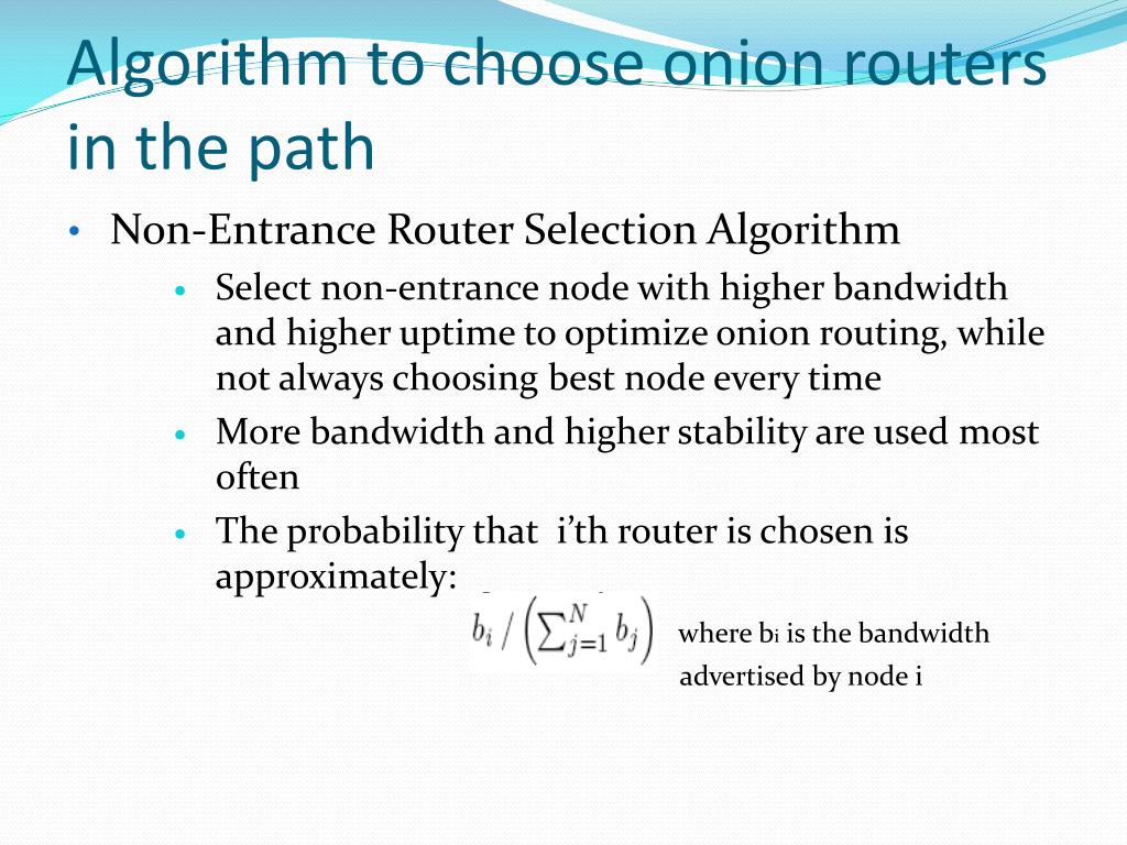Algorithm to choose onion routers in the path • Non-Entrance Router Selection Algorithm • Select non-entrance node with higher bandwidth and higher uptime to optimize onion routing, while not always choosing best node every time • More bandwidth and higher stability are used most often • The probability that i’th router is chosen is approximately: where bi is the bandwidth advertised by node i