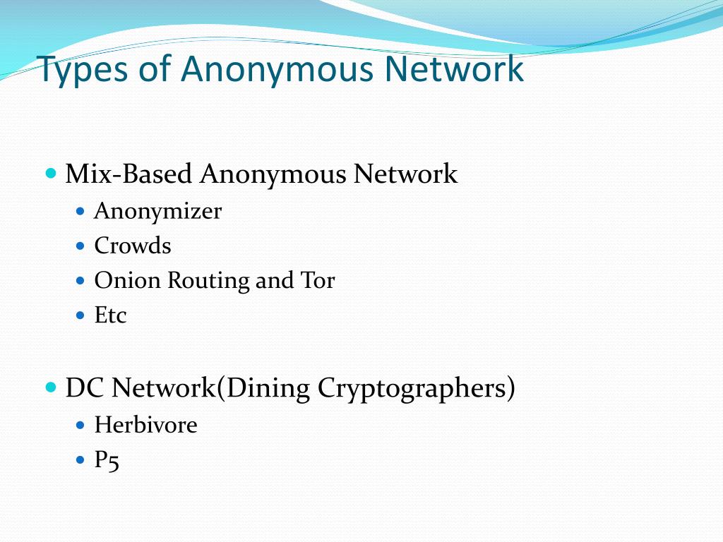 Types of Anonymous Network • Mix-Based Anonymous Network • Anonymizer • Crowds • Onion Routing and Tor • Etc • DC Network(Dining Cryptographers) • Herbivore • P5