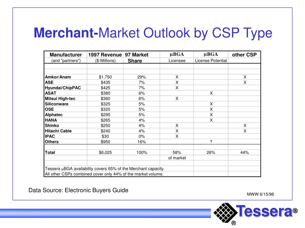 m m BGA BGA Manufacturer 1997 Revenue 97 Market Share other CSP (and "partners") ($-Millions) Licensee License Potential Amkor/Anam $1,750 29% X X ASE $435 7% X X Hyundai/ChipPAC $425 7% X ASAT $380 6% X Mitsui High-tec $360 6% X Siliconware $325 5% X OSE $320 5% X Alphatec $295 5% X HANA $265 4% X Shinko $250 4% X X Hitachi Cable $240 4% X X IPAC $30 0% X Others $950 16% ? Total $6,025 100% 58% 26% 44% of market Tessera mBGA availability covers 65% of the Merchant capacity. All other CSPs combined cover only 44% of the market volume. Merchant-Market Outlook by CSP Type Data Source: Electronic Buyers Guide MWW 6/15/98