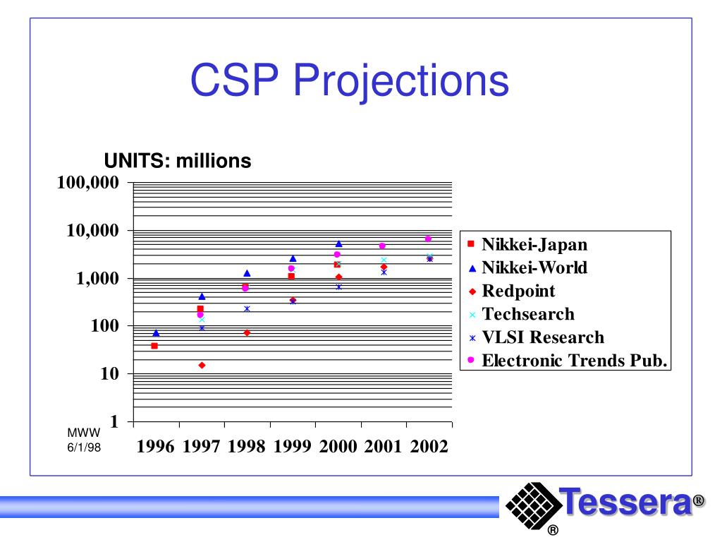 CSP Market Prediction. CSP Projections-Japan only Source: NIKKEI MICRODEVICES 2/98. UNITS: millions. MWW 6/1/98. CSP Projections Source: Redpoint Research 4/98. UNITS: millions. MWW 6/1/98. CSP Projections Source: TechSearch International ‘98. UNITS: millions. MWW 6/1/98.