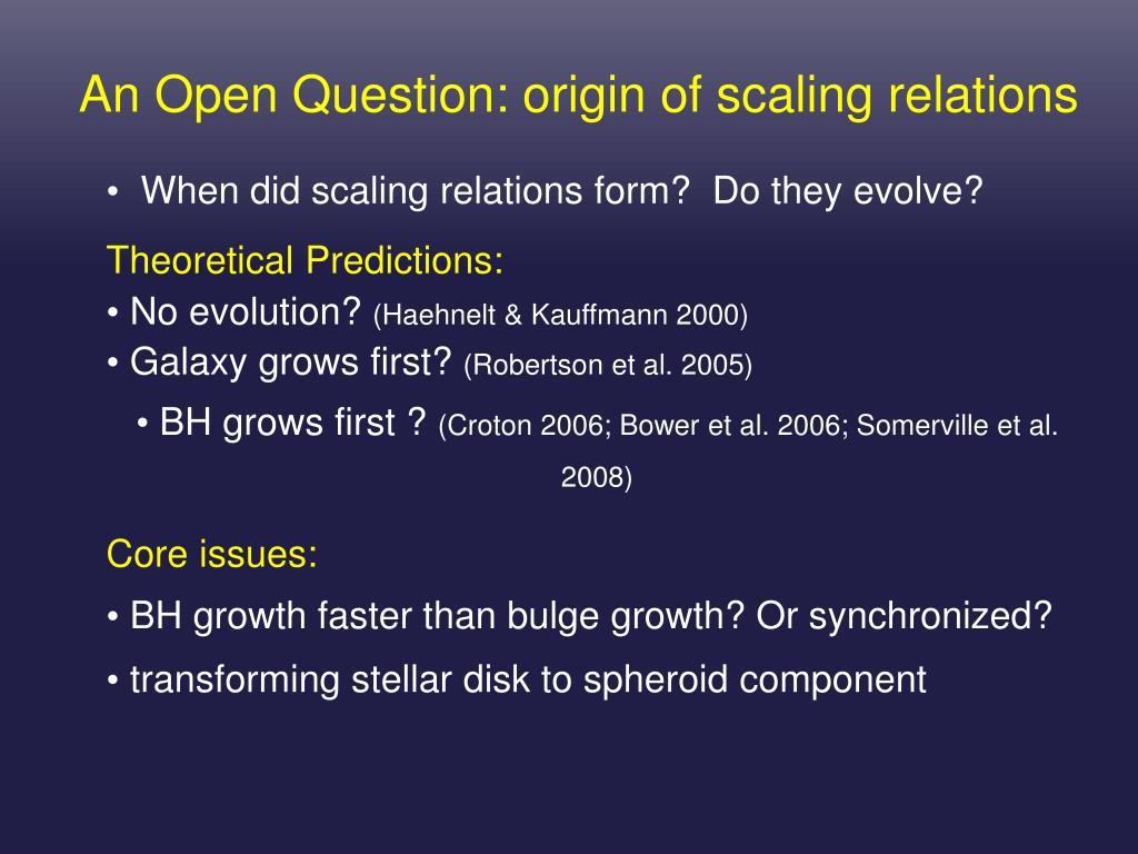 An Open Question: origin of scaling relations • When did scaling relations form? Do they evolve? • Theoretical Predictions: • No evolution? (Haehnelt & Kauffmann 2000) • Galaxy grows first? (Robertson et al. 2005) • BH grows first ? (Croton 2006; Bower et al. 2006; Somerville et al. 2008) • Core issues: • BH growth faster than bulge growth? Or synchronized? • transforming stellar disk to spheroid component