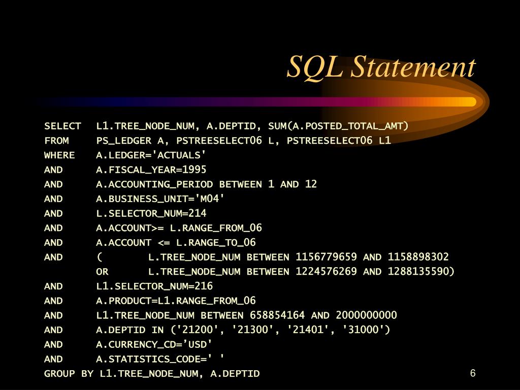 SQL Statement SELECT L1.TREE_NODE_NUM, A.DEPTID, SUM(A.POSTED_TOTAL_AMT) FROM PS_LEDGER A, PSTREESELECT06 L, PSTREESELECT06 L1 WHERE A.LEDGER='ACTUALS' AND A.FISCAL_YEAR=1995 AND A.ACCOUNTING_PERIOD BETWEEN 1 AND 12 AND A.BUSINESS_UNIT='M04' AND L.SELECTOR_NUM=214 AND A.ACCOUNT>= L.RANGE_FROM_06 AND A.ACCOUNT <= L.RANGE_TO_06 AND ( L.TREE_NODE_NUM BETWEEN 1156779659 AND 1158898302 OR L.TREE_NODE_NUM BETWEEN 1224576269 AND 1288135590) AND L1.SELECTOR_NUM=216 AND A.PRODUCT=L1.RANGE_FROM_06 AND L1.TREE_NODE_NUM BETWEEN 658854164 AND 2000000000 AND A.DEPTID IN ('21200', '21300', '21401', '31000') AND A.CURRENCY_CD=’USD' AND A.STATISTICS_CODE=' ' GROUP BY L1.TREE_NODE_NUM, A.DEPTID