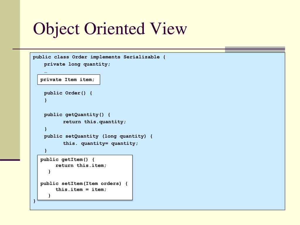 Object Oriented View public class Order implements Serializable { private long quantity; … private Item item; public Order() { } public getQuantity() { return this.quantity; } public setQuantity (long quantity) { this. quantity= quantity; } public getItem() { return this.item; } public setItem(Item orders) { this.item = item; } } } private Item item; public getItem() { return this.item; } public setItem(Item orders) { this.item = item; }
