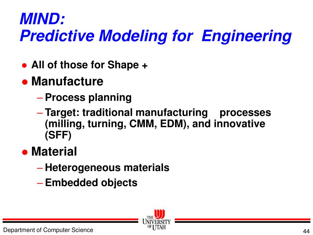 MIND: Predictive Modeling for Engineering • All of those for Shape + • Manufacture • Process planning • Target: traditional manufacturing processes (milling, turning, CMM, EDM), and innovative (SFF) • Material • Heterogeneous materials • Embedded objects
