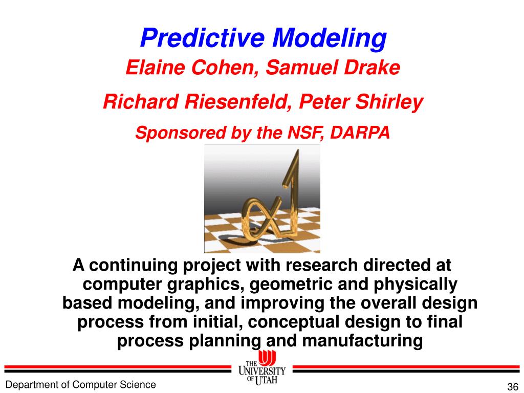 Elaine Cohen, Samuel Drake Richard Riesenfeld, Peter Shirley Sponsored by the NSF, DARPA Predictive Modeling A continuing project with research directed at computer graphics, geometric and physically based modeling, and improving the overall design process from initial, conceptual design to final process planning and manufacturing