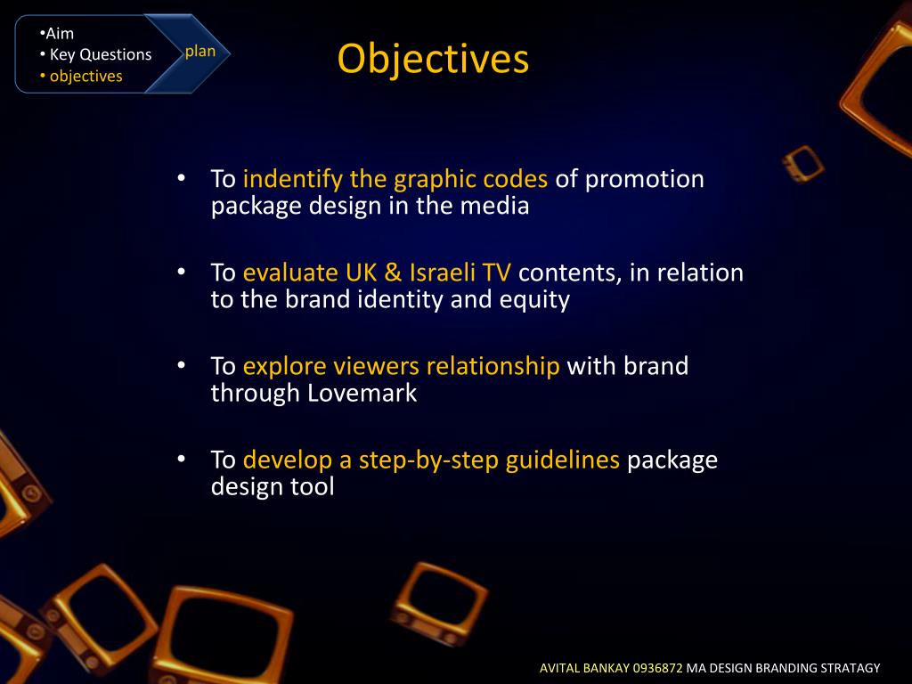 Aim • Key Questions • objectives Objectives • plan • To indentify the graphic codes of promotion package design in the media • To evaluate UK & Israeli TV contents, in relation to the brand identity and equity • To explore viewers relationship with brand through Lovemark • To develop a step-by-step guidelines package design tool AVITAL BANKAY 0936872 MA DESIGN BRANDING STRATAGY