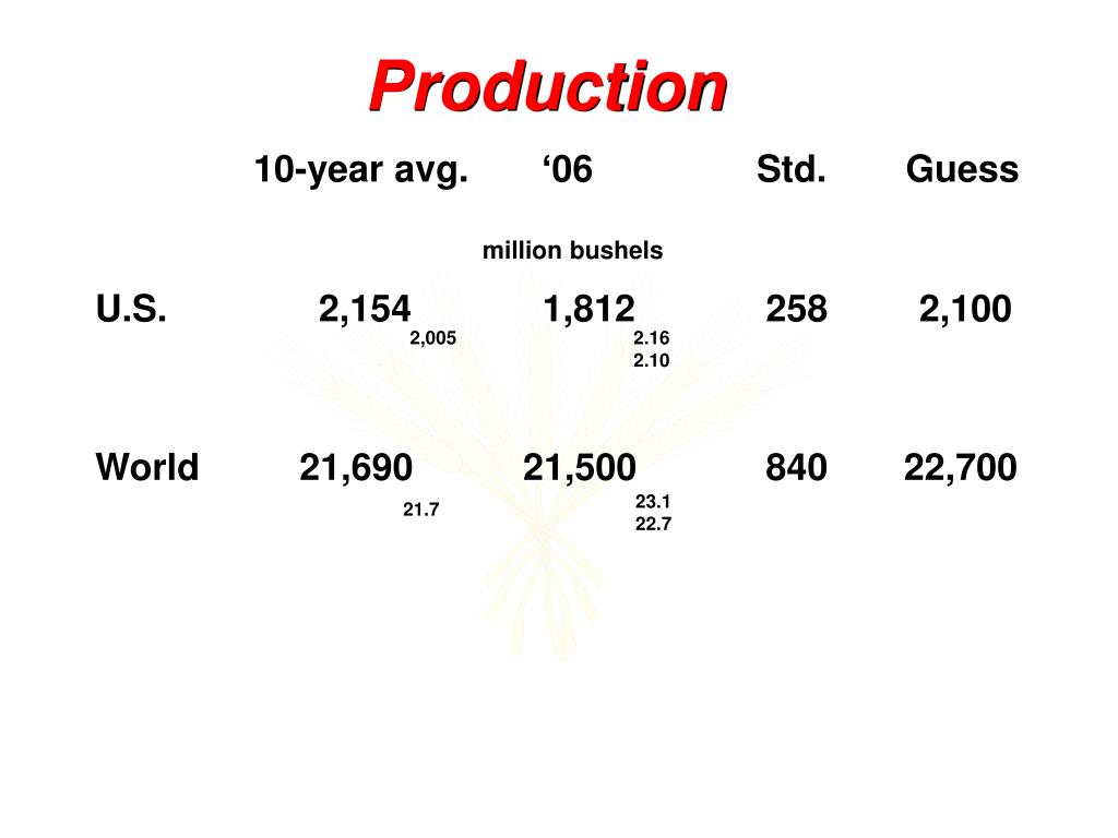 U.S. 2,154 1,812 258 2,100 2,005 2.16 2.10 World 21,690 21,500 840 22,700 23.1 22.7 21.7 Production 10-year avg. ‘06 Std. Guess million bushels