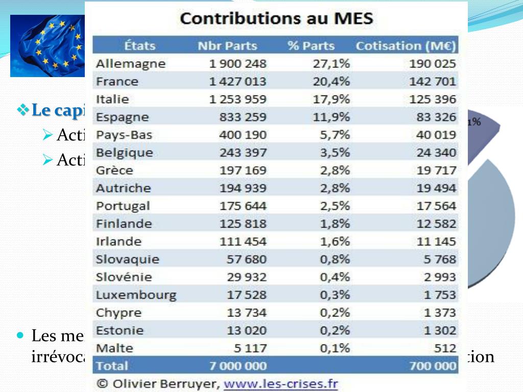 Capital • Le capital social : 700 mds€ • Actions libérées (réellement payés): 80 mds€ • Actions sujette à appel : 620 mds€ • Les membres doivent honorer inconditionnellement et irrévocablement leur engagement de fournir leur contribution