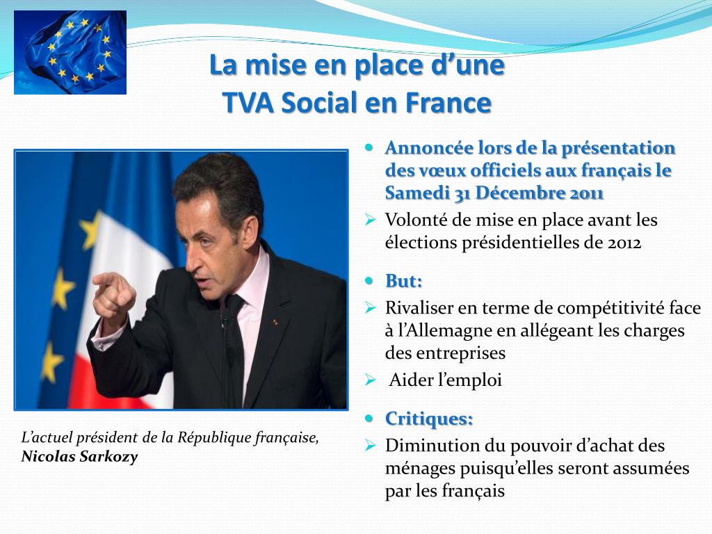 La mise en place d’une TVA Social en France • Annoncée lors de la présentation des vœux officiels aux français le Samedi 31 Décembre 2011 • Volonté de mise en place avant les élections présidentielles de 2012 • But: • Rivaliser en terme de compétitivité face à l’Allemagne en allégeant les charges des entreprises • Aider l’emploi • Critiques: • Diminution du pouvoir d’achat des ménages puisqu’elles seront assumées par les français L’actuel président de la République française, Nicolas Sarkozy