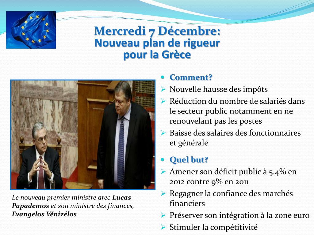 Mercredi 7 Décembre: • Nouveau plan de rigueur • pour la Grèce • Comment? • Nouvelle hausse des impôts • Réduction du nombre de salariés dans le secteur public notamment en ne renouvelant pas les postes • Baisse des salaires des fonctionnaires et générale • Quel but? • Amener son déficit public à 5.4% en 2012 contre 9% en 2011 • Regagner la confiance des marchés financiers • Préserver son intégration à la zone euro • Stimuler la compétitivité Le nouveau premier ministre grec Lucas Papademoset son ministre des finances, EvangelosVénizélos