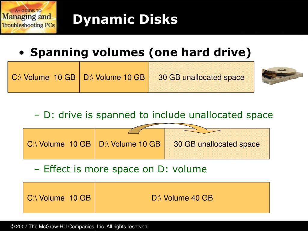 Dynamic Disks • Spanning volumes (one hard drive) • D: drive is spanned to include unallocated space • Effect is more space on D: volume C:\ Volume 10 GB D:\ Volume 10 GB 30 GB unallocated space C:\ Volume 10 GB D:\ Volume 10 GB 30 GB unallocated space C:\ Volume 10 GB D:\ Volume 40 GB