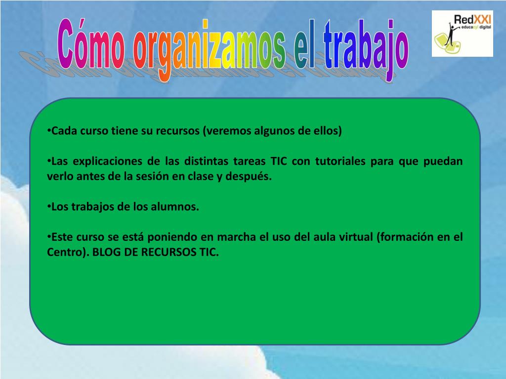 Cómo organizamos el trabajo • Cada curso tiene su recursos (veremos algunos de ellos) • Las explicaciones de las distintas tareas TIC con tutoriales para que puedan verlo antes de la sesión en clase y después. • Los trabajos de los alumnos. • Este curso se está poniendo en marcha el uso del aula virtual (formación en el Centro). BLOG DE RECURSOS TIC.
