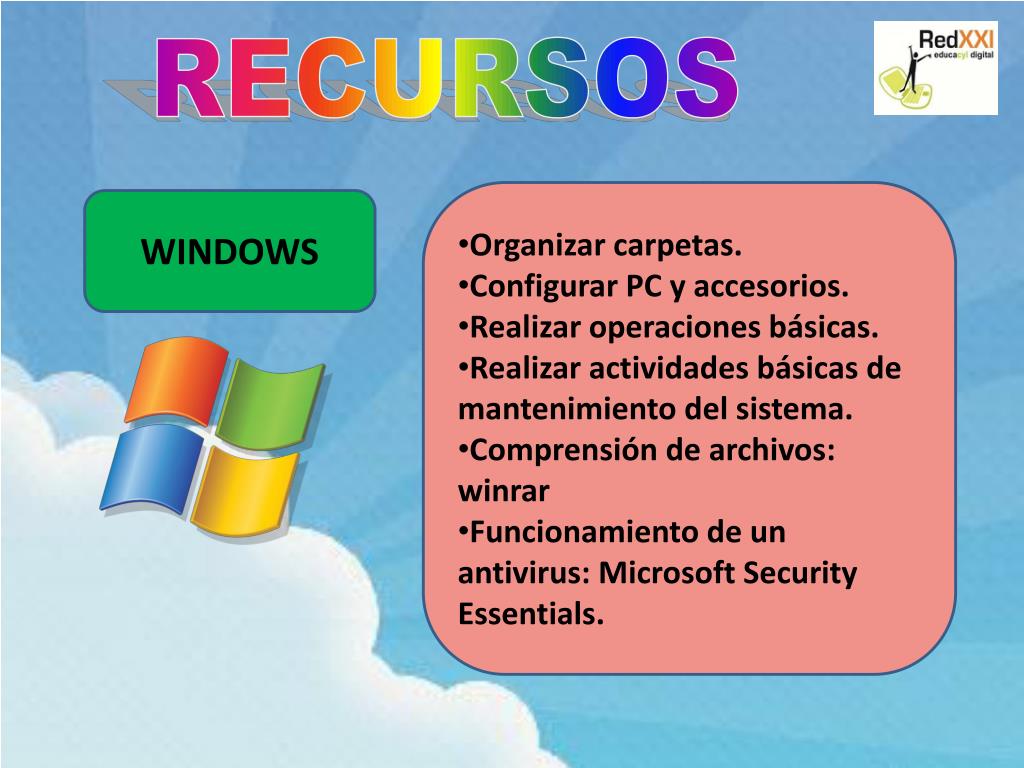 RECURSOS • Organizar carpetas. • Configurar PC y accesorios. • Realizar operaciones básicas. • Realizar actividades básicas de mantenimiento del sistema. • Comprensión de archivos: winrar • Funcionamiento de un antivirus: Microsoft Security Essentials. WINDOWS