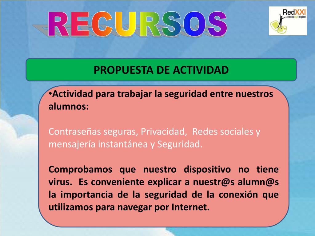 RECURSOS PROPUESTA DE ACTIVIDAD • Actividad para trabajar la seguridad entre nuestros alumnos: • Contraseñas seguras, Privacidad, Redes sociales y mensajería instantánea y Seguridad. • Comprobamos que nuestro dispositivo no tiene virus. Es conveniente explicar a nuestr@salumn@s la importancia de la seguridad de la conexión que utilizamos para navegar por Internet.