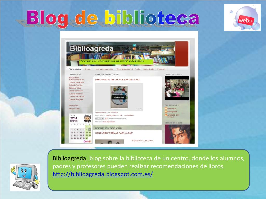 Blog de biblioteca Biblioagreda, blog sobre la biblioteca de un centro, donde los alumnos, padres y profesores pueden realizar recomendaciones de libros. http://biblioagreda.blogspot.com.es/