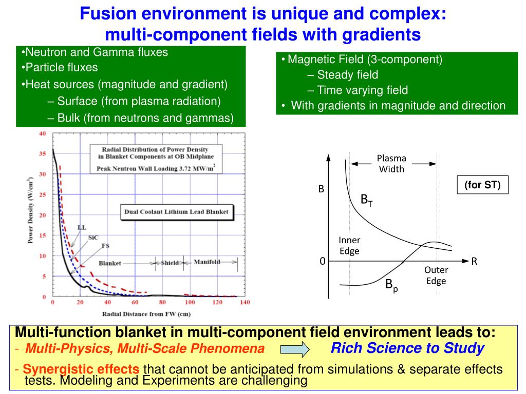 Fusion environment is unique and complex:multi-component fields with gradients • Neutron and Gamma fluxes • Particle fluxes • Heat sources (magnitude and gradient) • Surface (from plasma radiation) • Bulk (from neutrons and gammas) • Magnetic Field (3-component) • Steady field • Time varying field • With gradients in magnitude and direction Plasma Width (for ST) B BT Inner Edge 0 R Outer Edge Bp Multi-function blanket in multi-component field environmentleads to: • Multi-Physics, Multi-Scale PhenomenaRich Science to Study - Synergistic effectsthatcannotbe anticipated from simulations & separate effects tests. Modeling and Experiments are challenging