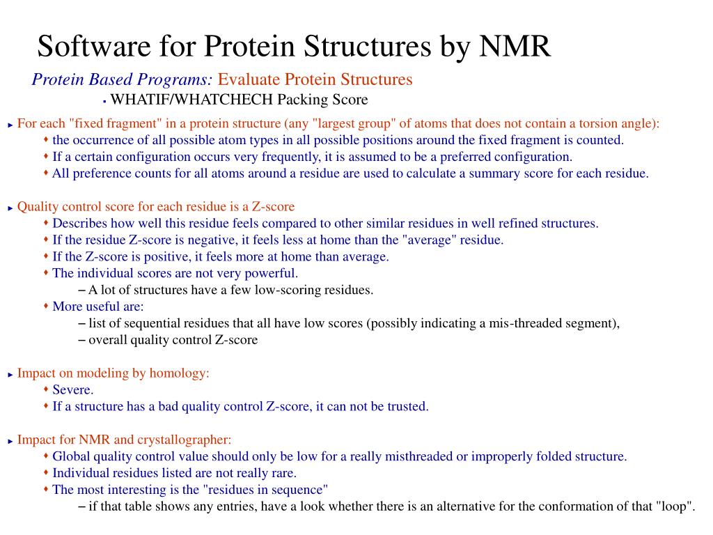 Software for Protein Structures by NMR • Protein Based Programs:Evaluate Protein Structures • WHATIF/WHATCHECH Packing Score • For each "fixed fragment" in a protein structure (any "largest group" of atoms that does not contain a torsion angle): • the occurrence of all possible atom types in all possible positions around the fixed fragment is counted. • If a certain configuration occurs very frequently, it is assumed to be a preferred configuration. • All preference counts for all atoms around a residue are used to calculate a summary score for each residue. • Quality control score for each residue is a Z-score • Describes how well this residue feels compared to other similar residues in well refined structures. • If the residue Z-score is negative, it feels less at home than the "average" residue. • If the Z-score is positive, it feels more at home than average. • The individual scores are not very powerful. • A lot of structures have a few low-scoring residues. • More useful are: • list of sequential residues that all have low scores (possibly indicating a mis-threaded segment), • overall quality control Z-score • Impact on modeling by homology: • Severe. • If a structure has a bad quality control Z-score, it can not be trusted. • Impact for NMR and crystallographer: • Global quality control value should only be low for a really misthreaded or improperly folded structure. • Individual residues listed are not really rare. • The most interesting is the "residues in sequence" • if that table shows any entries, have a look whether there is an alternative for the conformation of that "loop".