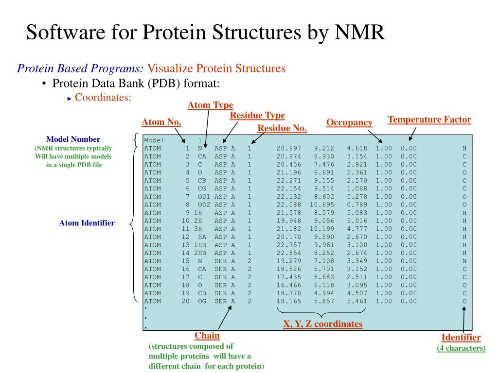 Software for Protein Structures by NMR • Protein NMR Based Software Programs: • There are multiple programs that have similar functions. • Not practical or necessary to discuss all the variety of programs that are available. • Applications will be discussed in general with specific references to a limited number • of programs. • Protein Based Programs:Visualize Protein Structures • How is the protein structure stored? • No uniform format. • Protein Data Bank (PDB) is the closest thing to a uniformed format • Most programs can read and/or write PDB file formats • Just about every program has its own proprietary format • Babel program can interconvert ~47 different structure formats • Common Information in a protein structure: • atoms, residues, chains • X, Y, Z coordinates