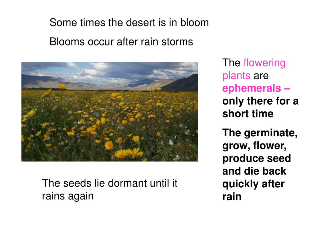 Hot Desert Plants. Some times the desert is in bloom Blooms occur after rain storms. The flowering plants are ephemerals – only there for a short time The germinate, grow, flower, produce seed and die back quickly after rain. The seeds lie dormant until it rains again.