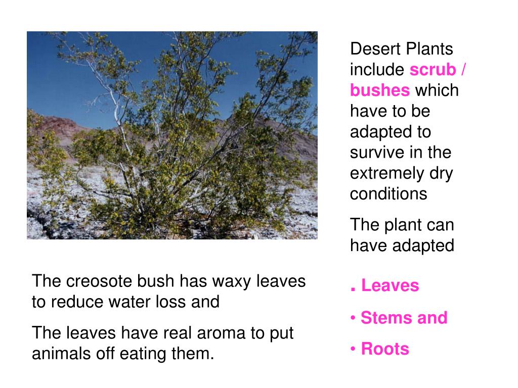 Desert Plants include scrub / bushes which have to be adapted to survive in the extremely dry conditions • The plant can have adapted • . Leaves • Stems and • Roots The creosote bush has waxy leaves to reduce water loss and The leaves have real aroma to put animals off eating them.