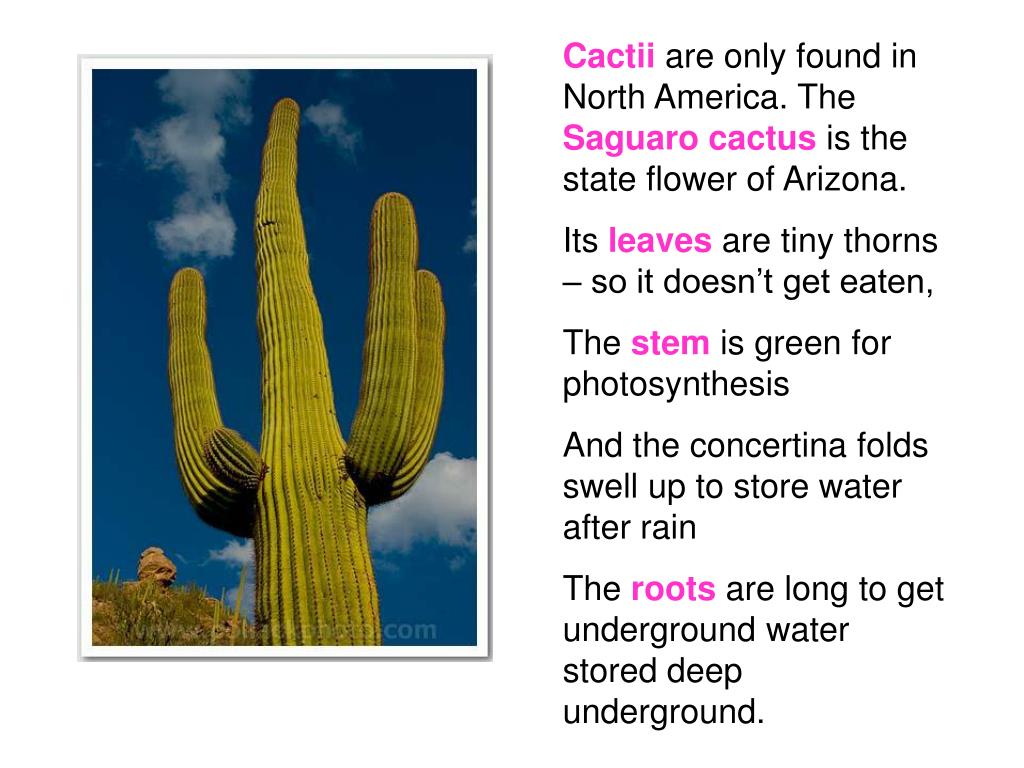 Cactii are only found in North America. The Saguaro cactus is the state flower of Arizona. Its leaves are tiny thorns – so it doesn’t get eaten, The stem is green for photosynthesis And the concertina folds swell up to store water after rain The roots are long to get underground water stored deep underground.