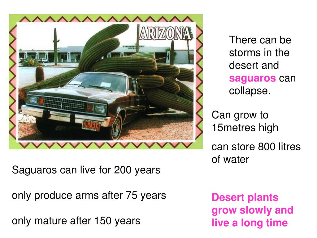 There can be storms in the desert and saguaros can collapse. Can grow to 15metres high can store 800 litres of water Desert plants grow slowly and live a long time Saguaros can live for 200 years only produce arms after 75 years only mature after 150 years