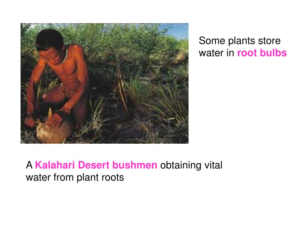 Some plants store water in root bulbs A Kalahari Desert bushmen obtaining vital water from plant roots