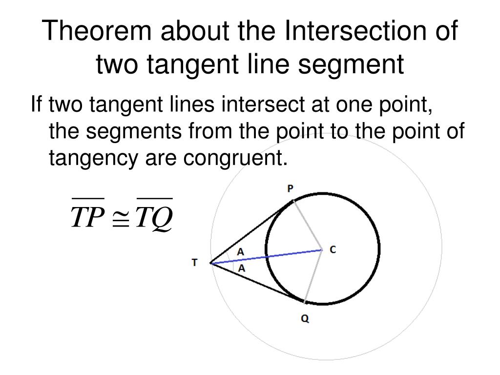 Theorem about the Intersection of two tangent line segment If two tangent lines intersect at one point, the segments from the point to the point of tangency are congruent.