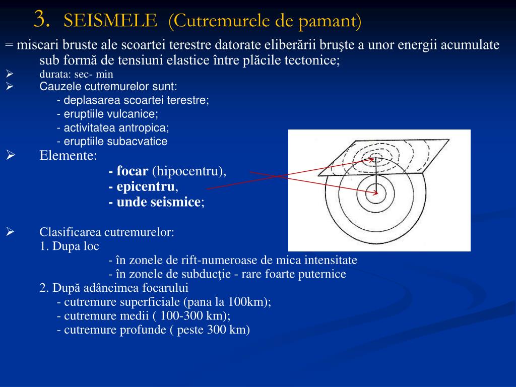 3. SEISMELE (Cutremurelede pamant) • = miscari bruste ale scoartei terestre datorate eliberării bruşte a unor energii acumulate sub formă de tensiuni elastice între plăcile tectonice; • durata: sec- min • Cauzelecutremurelorsunt: - deplasareascoarteiterestre; - eruptiilevulcanice; - activitateaantropica; - eruptiilesubacvatice • Elemente: • - focar(hipocentru), • - epicentru, • - unde seismice; • Clasificarea cutremurelor: • 1. Dupa loc • - în zonele de rift-numeroase de mica intensitate • - în zonele de subducţie - rare foarte puternice • 2. După adâncimea focarului • - cutremure superficiale (pana la 100km); • - cutremure medii ( 100-300 km); • - cutremure profunde ( peste 300 km)