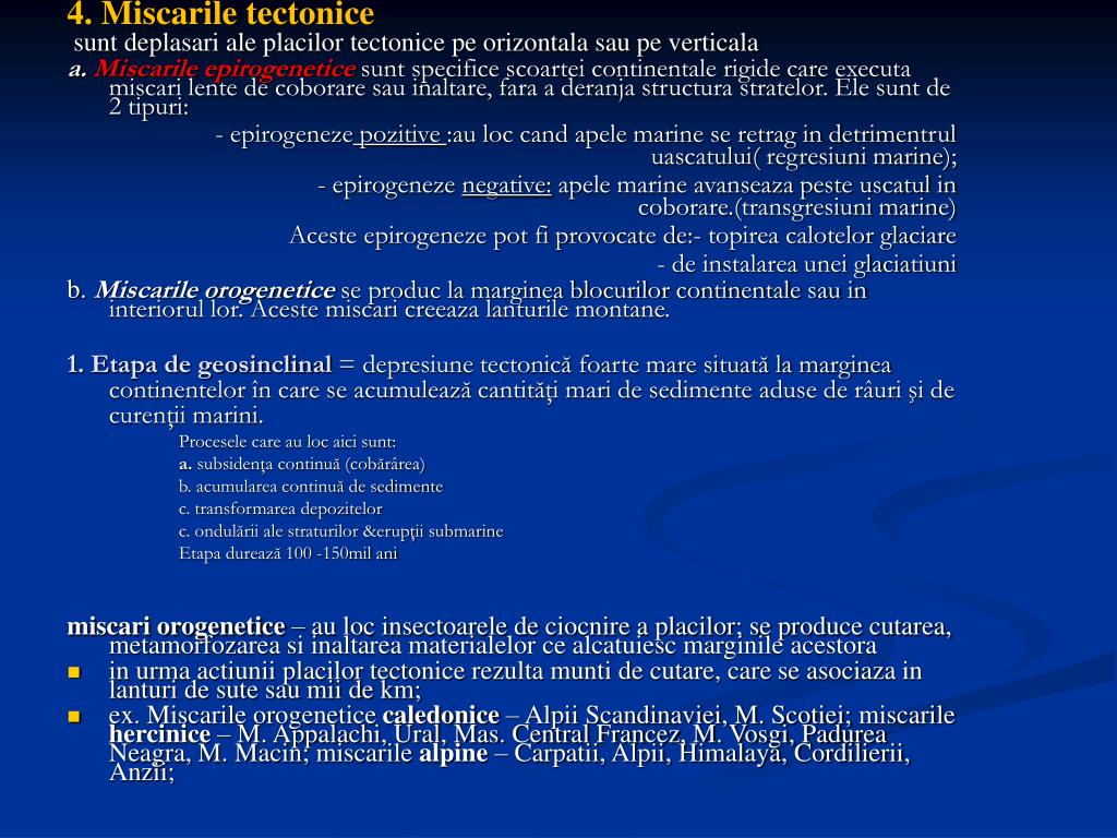 4. Miscarile tectonice sunt deplasari ale placilor tectonice pe orizontala sau pe verticala a. Miscarile epirogeneticesunt specifice scoartei continentale rigide care executa miscari lente de coborare sau inaltare, fara a deranja structura stratelor. Ele sunt de 2 tipuri: - epirogeneze pozitive :au loc cand apele marine se retrag in detrimentrul uascatului( regresiuni marine); - epirogeneze negative: apele marine avanseaza peste uscatul in coborare.(transgresiuni marine) Aceste epirogeneze pot fi provocate de:- topirea calotelor glaciare - de instalarea unei glaciatiuni b. Miscarile orogenetice se produc la marginea blocurilor continentale sau in interiorul lor. Aceste miscari creeaza lanturile montane. 1. Etapa de geosinclinal= depresiune tectonică foarte mare situată la marginea continentelor în care se acumulează cantităţi mari de sedimente aduse de râuri şi de curenţii marini. Procesele care au loc aici sunt: a. subsidenţa continuă (cobărârea) b. acumularea continuă de sedimente c. transformarea depozitelor c. ondulării ale straturilor &erupţii submarine Etapa durează 100 -150mil ani miscari orogenetice – au loc insectoarele de ciocnire a placilor; se produce cutarea, metamorfozarea si inaltarea materialelor ce alcatuiesc marginile acestora • in urma actiunii placilor tectonice rezulta munti de cutare, care se asociaza in lanturi de sute sau mii de km; • ex. Miscarile orogenetice caledonice – Alpii Scandinaviei, M. Scotiei; miscarile hercinice – M. Appalachi, Ural, Mas. Central Francez, M. Vosgi, Padurea Neagra, M. Macin; miscarile alpine – Carpatii, Alpii, Himalaya, Cordilierii, Anzii;