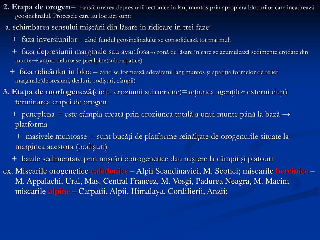 2. Etapa de orogen= transformarea depresiunii tectonice în lanţ muntos prin apropiera blocurilor care încadrează geosinclinalul. Procesele care au loc aici sunt: a. schimbarea sensului mişcării din lăsare în ridicare în trei faze: + faza inversiunilor - când fundul geosinclinalului se consolidează tot mai mult + faza depresiunii marginale sau avanfosa-o zonă de lăsare în care se acumulează sedimente erodate din munte→lanţuri deluroase prealpine(subcarpatice) + faza ridicărilor în bloc – când se formează adevăratul lanţ muntos şi apariţia formelor de relief marginale(depresiuni, dealuri, podişuri, câmpii) 3. Etapa de morfogeneză(ciclul eroziunii subaeriene)=acţiunea agenţilor externi după terminarea etapei de orogen + peneplena = este câmpia creată prin eroziunea totală a unui munte până la bază → platforma + masivele muntoase = sunt bucăţi de platforme reînălţate de orogenurile situate la marginea acestora (podişuri) + bazile sedimentare prin mişcări epirogenetice dau naştere la câmpii şi platouri ex. Miscarile orogenetice caledonice – Alpii Scandinaviei, M. Scotiei; miscarile hercinice – M. Appalachi, Ural, Mas. Central Francez, M. Vosgi, Padurea Neagra, M. Macin; miscarile alpine – Carpatii, Alpii, Himalaya, Cordilierii, Anzii;